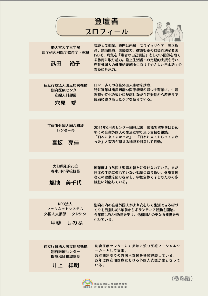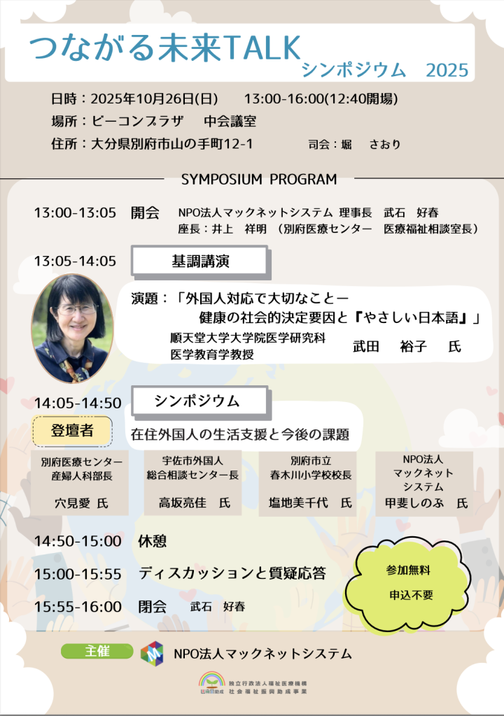 つながる未来TALK シンポジウム2025 イベント 2025年10月1日By asa / 2025年10月1日 「つながる未来 TALK」と題して、外国人支援部クレシタ初のシンポジウムを開催します! 順天堂大学大学院 医学研究科医学教育学 教授 武田裕子先生をはじめ、素晴らしい方々が登壇してくださいます。 〇医療機関 〇外国人総合相談センター 〇教育機関 〇NPO法人 それぞれの立場から、在住外国人支援を通して✽.。.:*・゚ みなさんのご参加を心よりお待ちしています! —事前申込不要— —参加無料— 【お問合わせ】 NPO法人マックネットシステム(甲斐) 0977-75-6053